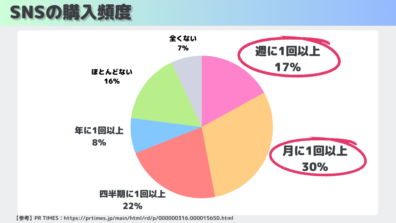 約半数のユーザーがSNSの情報を参考に「月に1回以上」商品を購入していることがわかります。