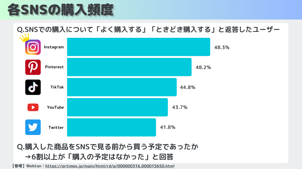 各SNSの中でもインスタグラムが最も商品購入のきっかけになっている媒体です。